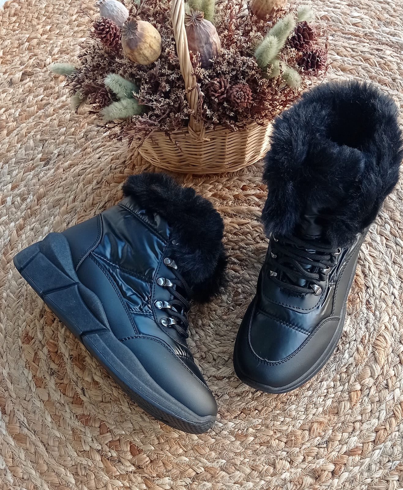 Bota fabricada en material reciclado e impermeable de color negro con pelito por arriba y por el interior.