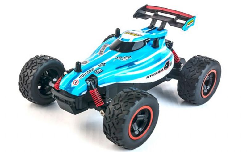 Buggy con gran capacidad de giro y emisora de 2,4Ghz para jugar en grupo sin interferencias. Suspensión en las 4 ruedas. Aceleración progresiva.
