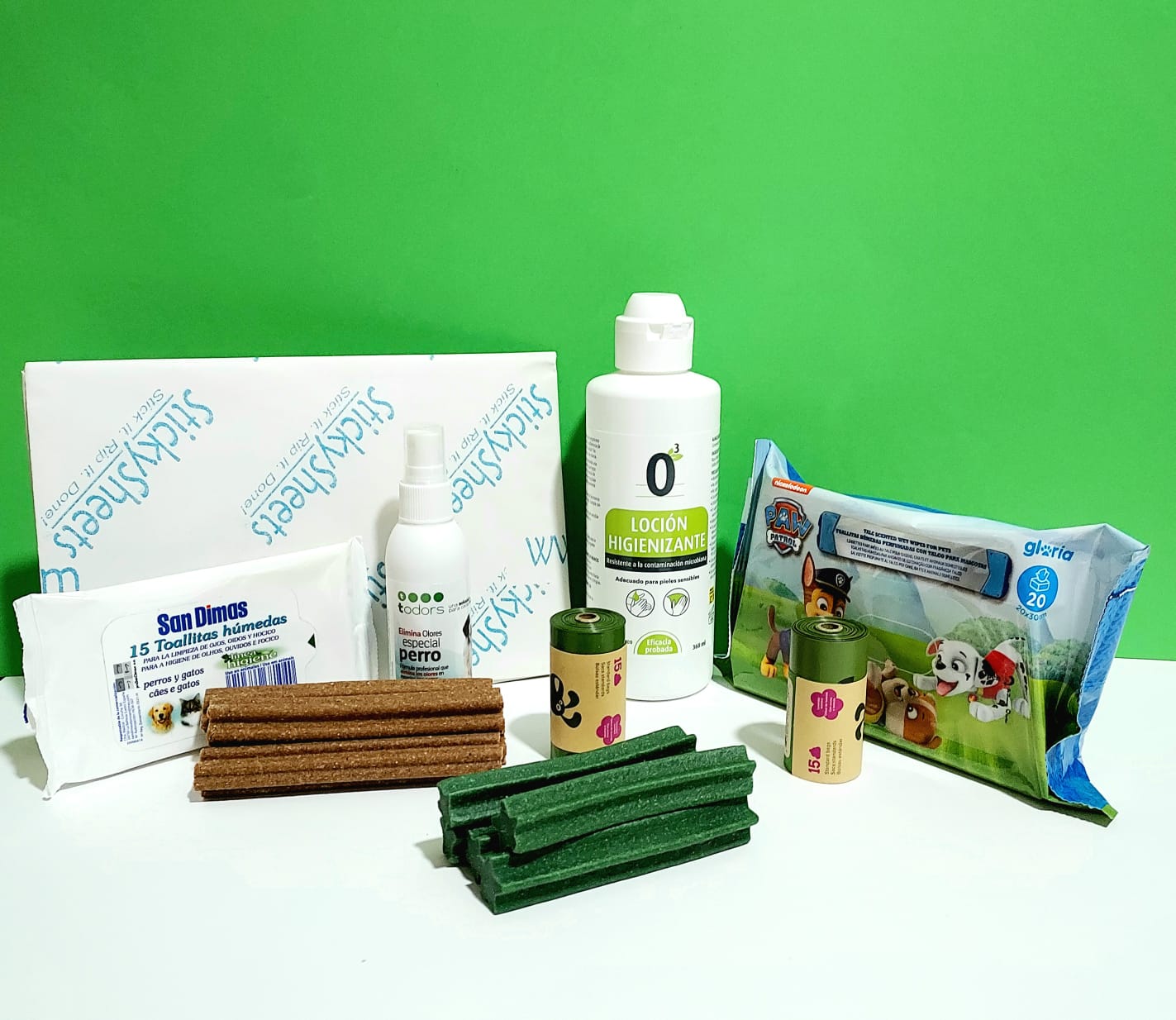 - Toallitas muy húmedas perfumadas: con talco para mascotas, contiene 20 toallitas de 20 x 30 centímetros.
